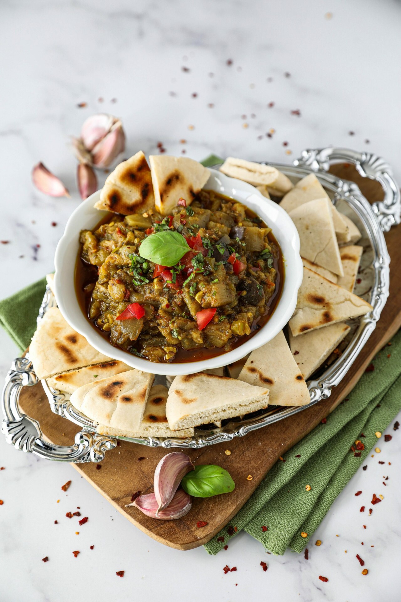 e, salade van geroosterde aubergines, tomaat met frisse tàboulehsalade