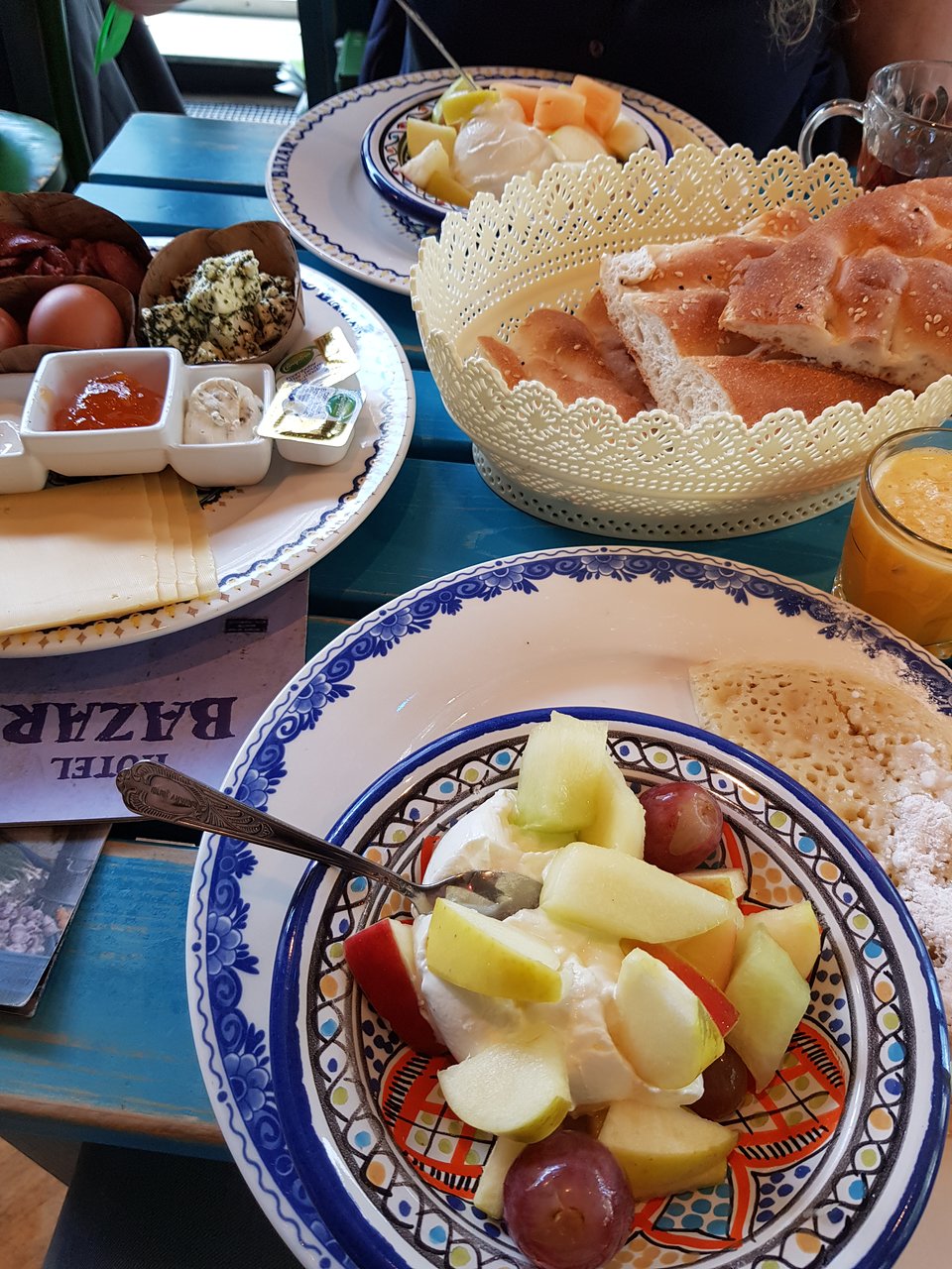 roomkaas, kaymak, abrikozenconfiture, honing, duizend-gaten-flensje, yoghurt met vers fruit,